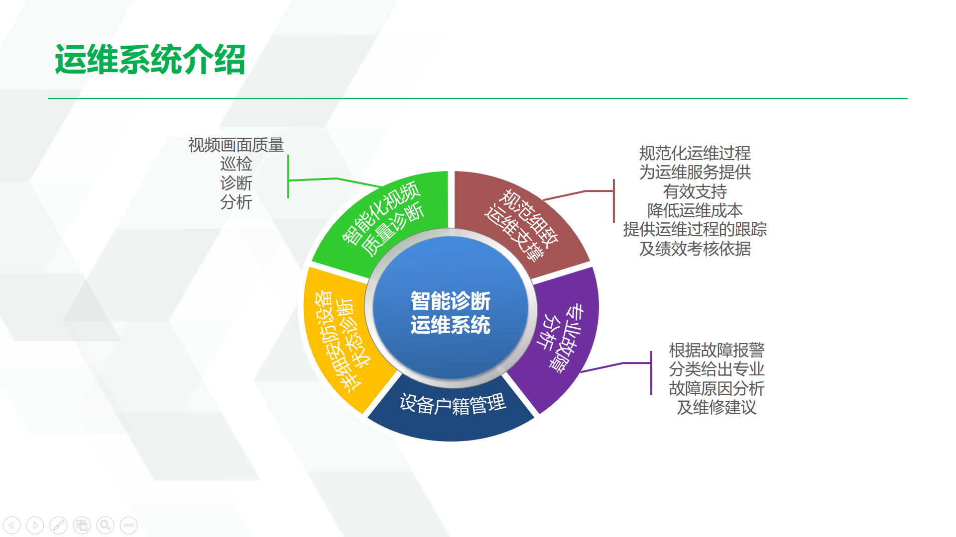 智能诊断运维系统是面向安防视频场景的一体化运维管理平台,以智能化视频质量诊断为核心,整合多维度能力,为视频监控类业务提供全生命周期运维保障。