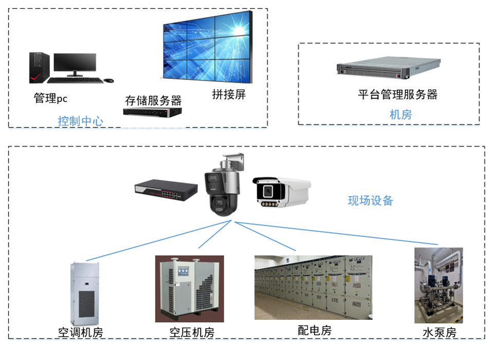 - 现场设备层:在 4 个核心设备间(空调机房、空压机房、配电房、水泵房)部署 18 个监控点位,通过高清摄像机、工业交换机等前端设备,实现全区域视频采集与数据回传,覆盖所有关键运维场景。